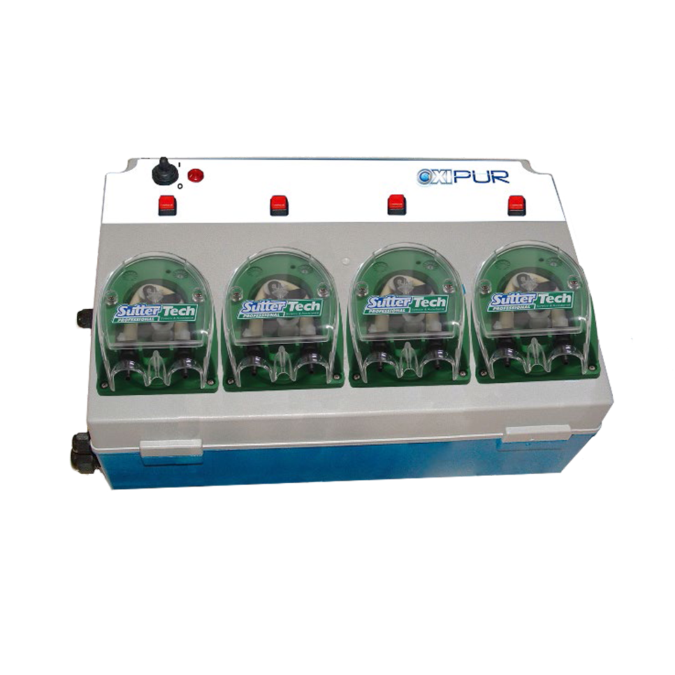 Sistema di dosaggio per lavatrici con capacità fino a 25kg, per il dosaggio di 4 prodotti con portata 18 lt/h. Sistema personalizzato "SUTTER PROFESSIONAL" a 4 pompe, con kit di installazione e lance d'aspirazione. Possibilità di regolare la velocità di rotazione della pompa e la quantità di detergente erogato ruotando, con un cacciavite, il trimmer.